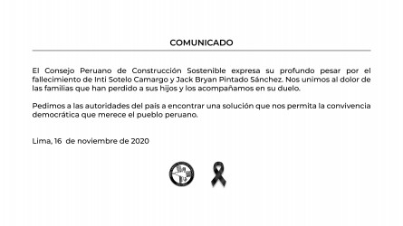 El Consejo Peruano de Construcción Sostenible expresa su profundo pesar por el fallecimiento de Inti Sotelo Camargo y Jack Bryan Pintado Sánchez. Nos unimos al dolor de las familias que han perdido a sus hijos y los acompañamos en su duelo.