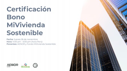 Fecha: Jueves 26 de noviembre Hora: 4:00 pm - 5:00 pm (hora Perú) Ponentes: AENOR Perú y Fondo MiVivienda Sostenible